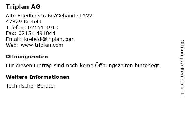 | Öffnungszeiten Triplan AG in Krefeld anzeigen | |