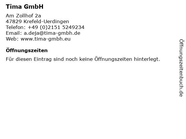 | Öffnungszeiten Tima GmbH in Krefeld-Uerdingen anzeigen | |