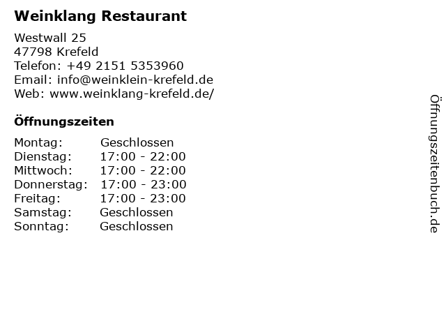 | Öffnungszeiten Weinklang Restaurant in Krefeld anzeigen | |