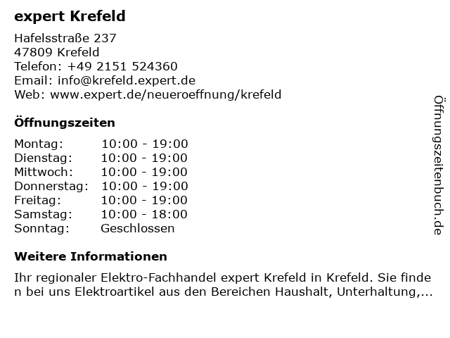 | Öffnungszeiten expert Krefeld in Krefeld anzeigen | |