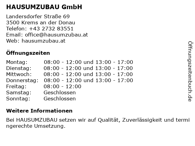 | Öffnungszeiten HAUSUMZUBAU GmbH in Krems an der Donau anzeigen | |