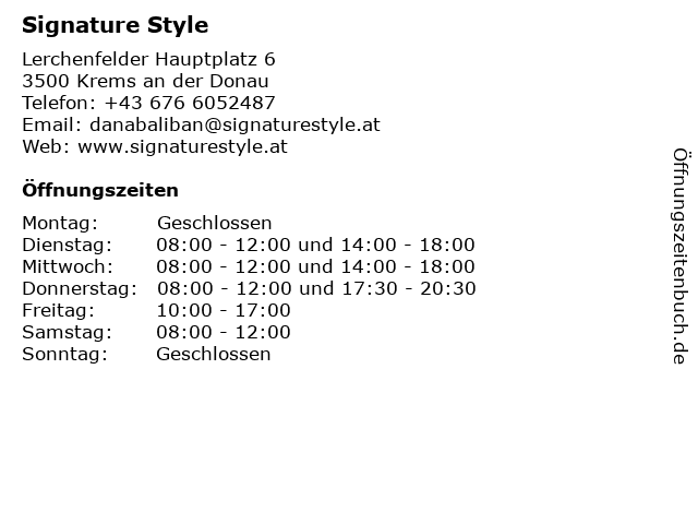 | Öffnungszeiten Signature Style in Krems an der Donau anzeigen | |