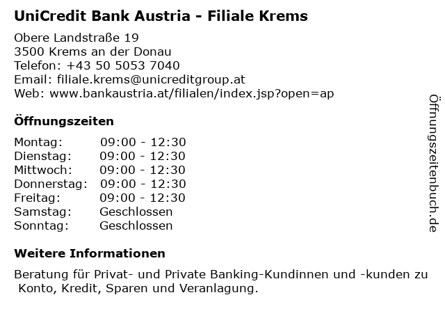 Branchen & Suchbegriffe zu UniCredit Bank Austria - Filiale Krems:austria, bank, krems, privat- und private banking-kundinnen und -kunden, unicredit |