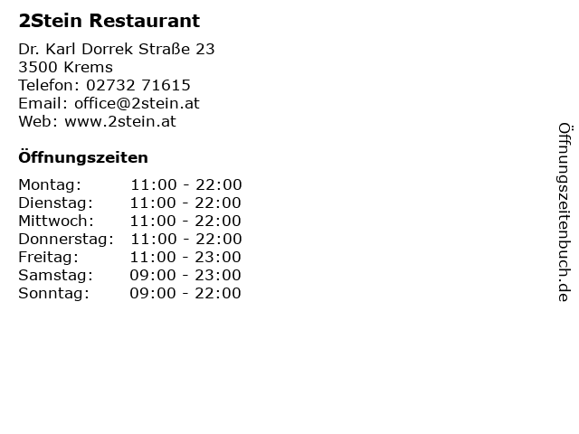 | Öffnungszeiten 2Stein Restaurant in Krems anzeigen | |