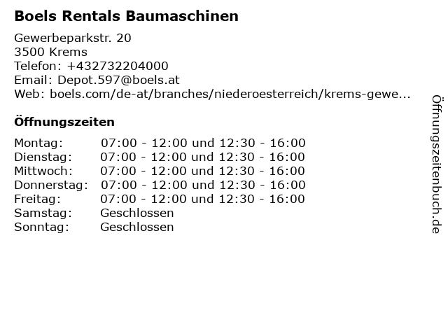 | Öffnungszeiten Boels Rentals Baumaschinen in Krems anzeigen | |