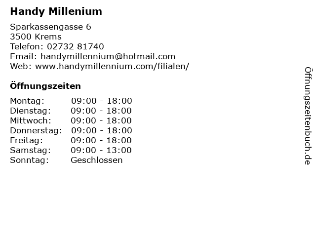 | Öffnungszeiten Handy Millenium in Krems anzeigen | |