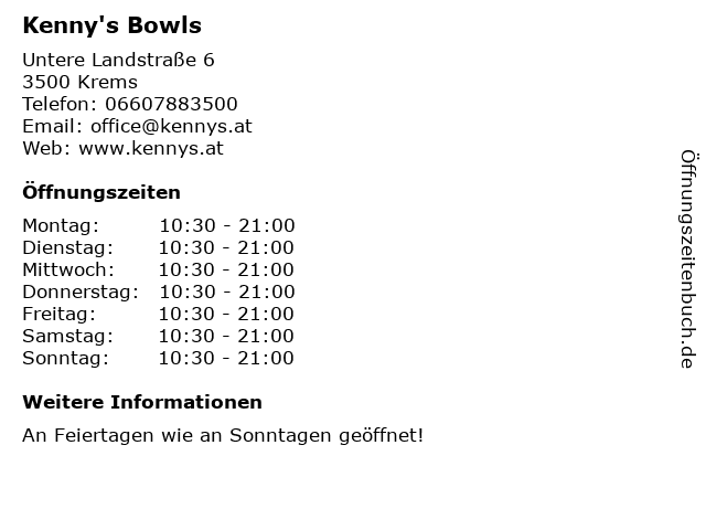| Öffnungszeiten Kenny's Bowls in Krems anzeigen | |