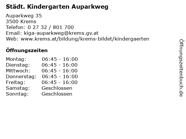 | Öffnungszeiten Städt. Kindergarten Auparkweg in Krems anzeigen | |