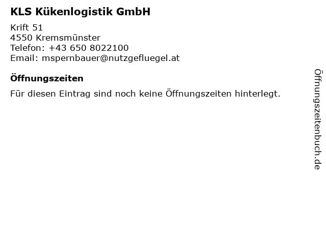 | Öffnungszeiten KLS Kükenlogistik GmbH in Kremsmünster anzeigen | |