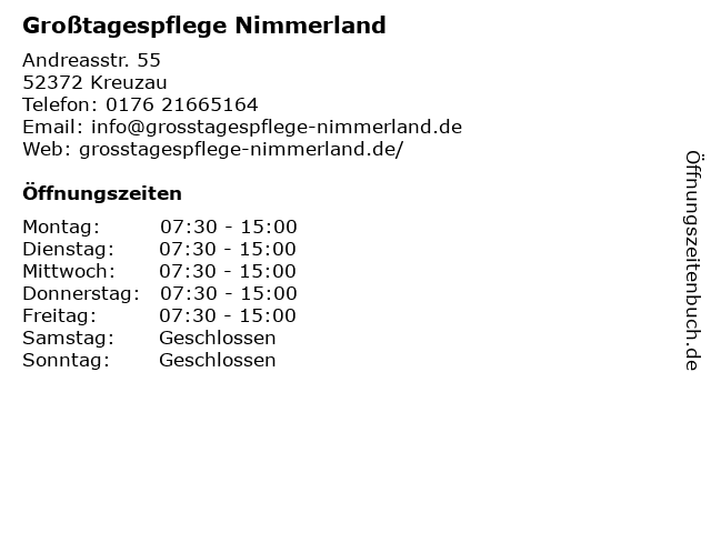| Öffnungszeiten Großtagespflege Nimmerland in Kreuzau anzeigen | |