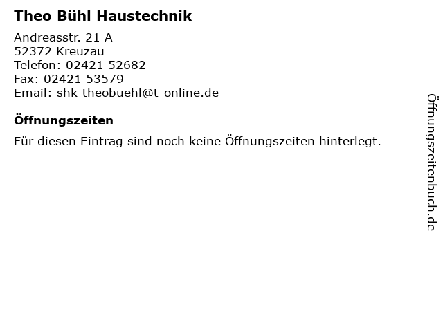 | Öffnungszeiten Theo Bühl Haustechnik in Kreuzau anzeigen | |