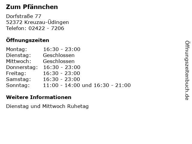 | Öffnungszeiten Zum Pfännchen in Kreuzau-Üdingen anzeigen | |