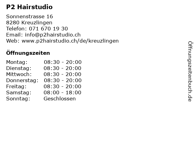 | Öffnungszeiten P2 Hairstudio in Kreuzlingen anzeigen | |