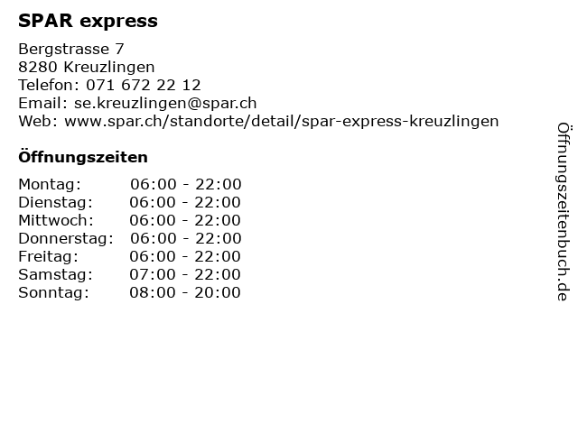 | Öffnungszeiten SPAR express in Kreuzlingen anzeigen | |