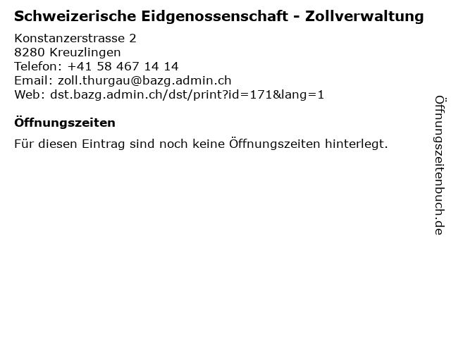 1 Schweizerische Eidgenossenschaft - Zollverwaltung (Entfernung: 1,07 km) Konstanzerstrasse 121, 8274 Tägerwilen 3 Schweizerische Eidgenossenschaft - Zollverwaltung (Entfernung: 18,74 km) Friedrichshafnerstrasse 1, 8590 Romanshorn 6 Die Schweizerische Post AG - Filiale Tägerwilen (Geschäftskundenschalter) (Entfernung: 2,75 km) Bahnhofstrasse 16, 8274 Tägerwilen |