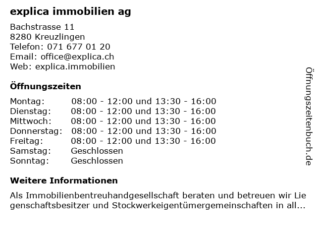 | Öffnungszeiten explica immobilien ag in Kreuzlingen anzeigen | |
