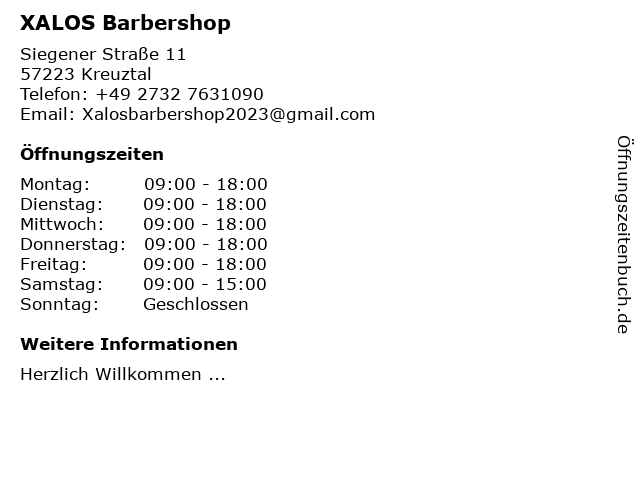 | Öffnungszeiten XALOS Barbershop in Kreuztal anzeigen | |