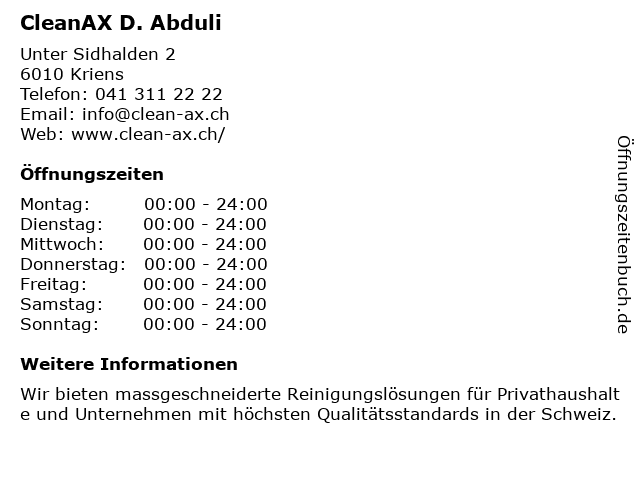| Öffnungszeiten CleanAX D. Abduli in Kriens anzeigen | |