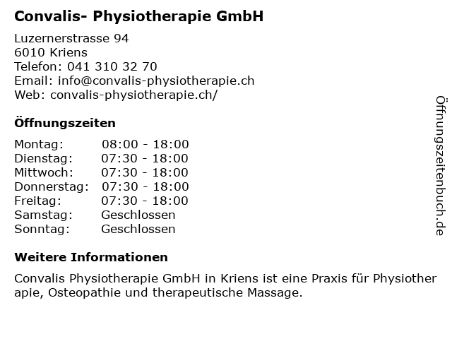 | Öffnungszeiten Convalis- Physiotherapie GmbH in Kriens anzeigen | |