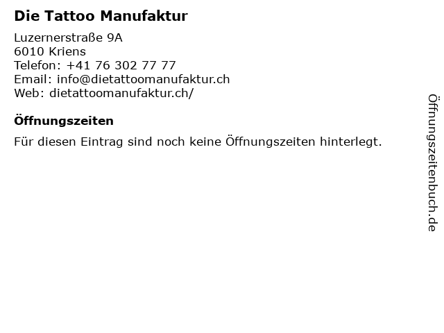 | Öffnungszeiten Die Tattoo Manufaktur in Kriens anzeigen | |