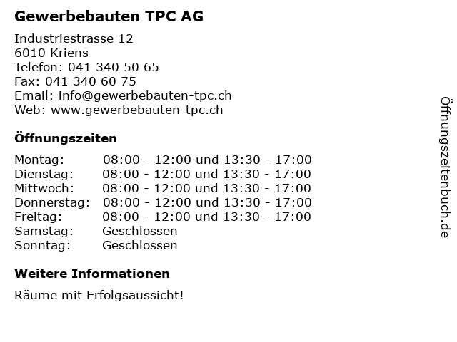 | Öffnungszeiten Gewerbebauten TPC AG in Kriens anzeigen | |