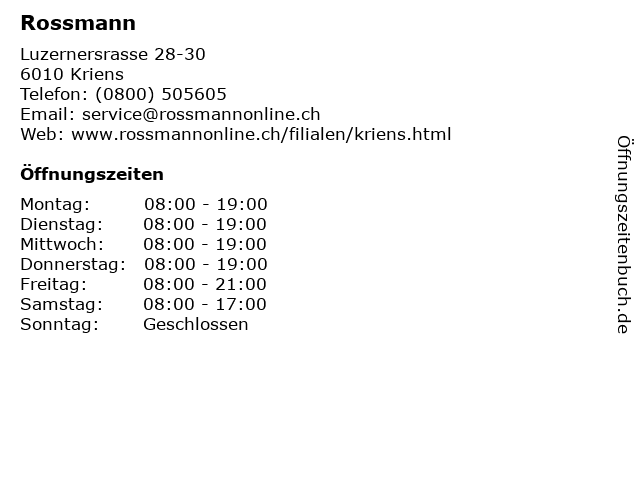 | Öffnungszeiten Rossmann in Kriens anzeigen | |