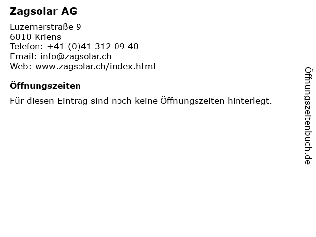 | Öffnungszeiten Zagsolar AG in Kriens anzeigen | |