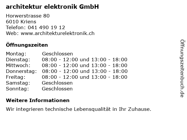 | Öffnungszeiten architektur elektronik GmbH in Kriens anzeigen | |