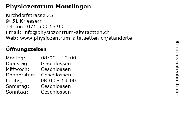 | Öffnungszeiten Physiozentrum Montlingen in Kriessern anzeigen | |