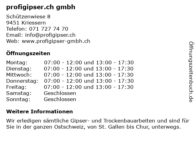 | Öffnungszeiten profigipser.ch gmbh in Kriessern anzeigen | |
