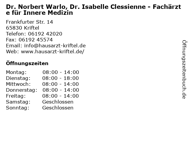 3 Dr. med. Annette Eid - Praxis für zeitgemäße chinesische Medizin (Entfernung: 0,45 km) Frankfurter Str. 67 a, 65830 Kriftel 4 Norbert Altenkamp MdB - Wahlkreisbüro (Entfernung: 1,07 km) Hattersheimer Straße 46, 65719 Hofheim am Taunus 6 Lothar Meier Facharzt für Innere Medizin und Rheumatologie (Entfernung: 1,49 km) Reifenberger Str. 6, 65719 Hofheim |