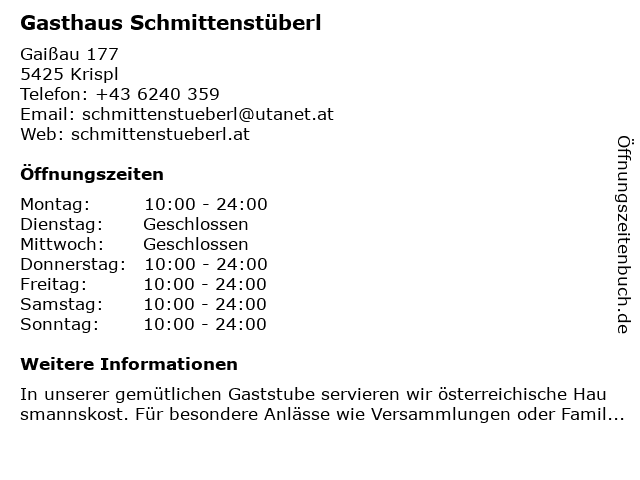 | Öffnungszeiten Gasthaus Schmittenstüberl in Krispl anzeigen | |