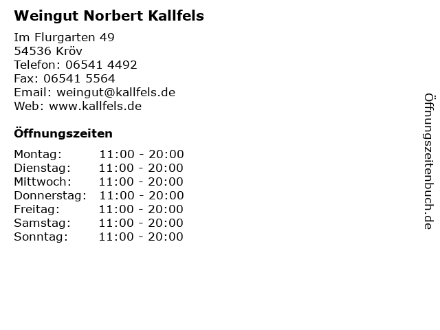 | Öffnungszeiten Weingut Norbert Kallfels in Kröv anzeigen | |