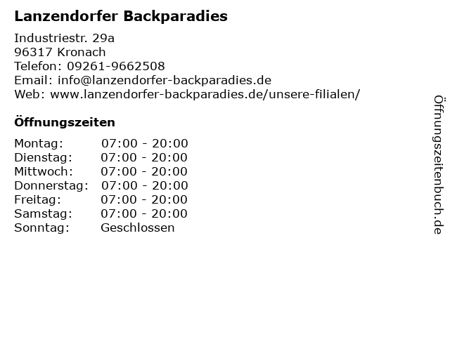| Öffnungszeiten Lanzendorfer Backparadies in Kronach anzeigen | |