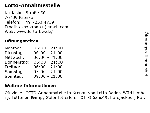 | Öffnungszeiten Lotto-Annahmestelle in Kronau anzeigen | |