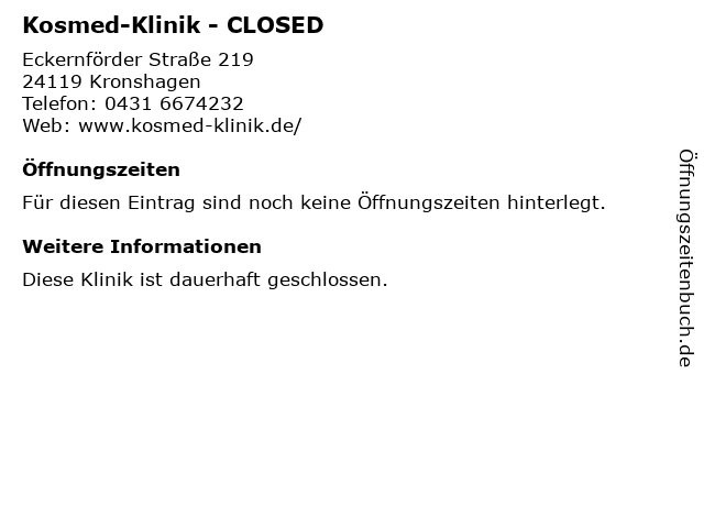 | Öffnungszeiten Kosmed-Klinik - CLOSED in Kronshagen anzeigen | |