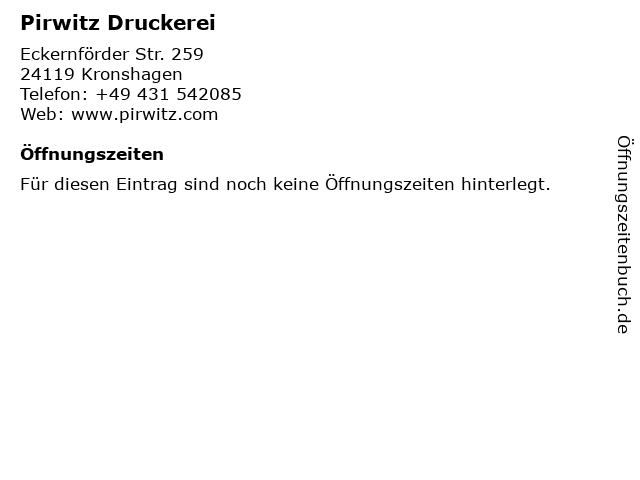 | Öffnungszeiten Pirwitz Druckerei in Kronshagen anzeigen | |