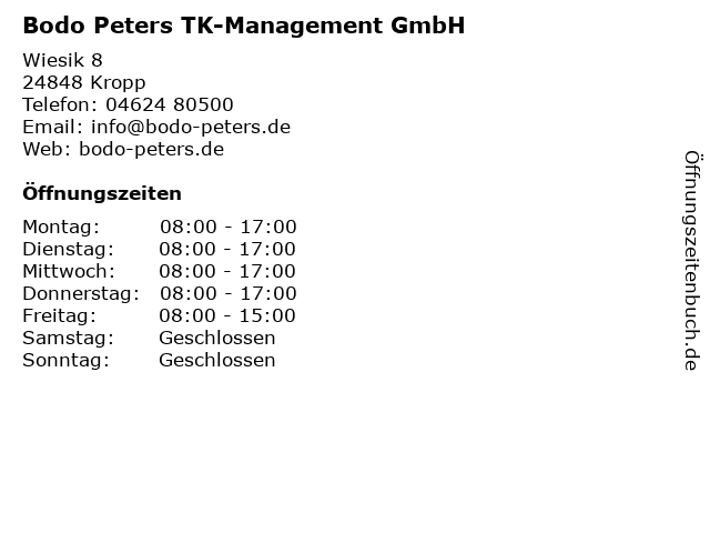 Öffnungszeiten Bodo Peters TK-Management GmbH in Kropp anzeigen | |
