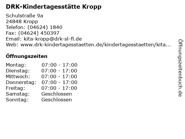 | Öffnungszeiten DRK-Kindertagesstätte Kropp in Kropp anzeigen | |