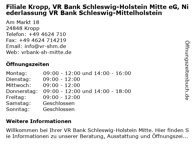 Branchen & Suchbegriffe zu Filiale Kropp, VR Bank Schleswig-Holstein Mitte eG, Niederlassung VR Bank Schleswig-Mittelholstein:bank, eg, holstein, kropp, mitte, mittelholstein, niederlassung, vr |