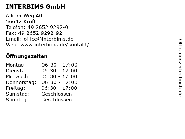 | Öffnungszeiten INTERBIMS GmbH in Kruft anzeigen | |