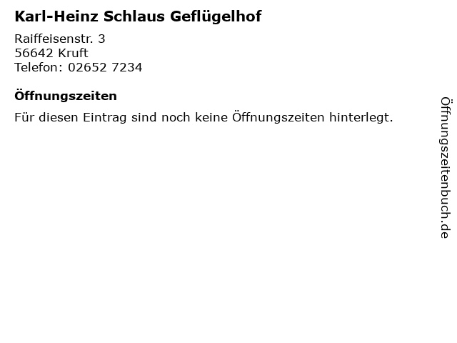 | Telefonnummer Karl-Heinz Schlaus Geflügelhof in Kruft (02652 7234) anrufen | |