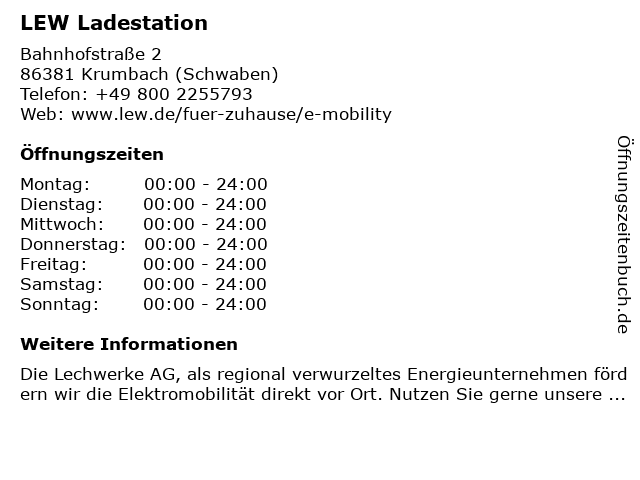 Öffnungszeiten LEW Ladestation in Krumbach (Schwaben) anzeigen