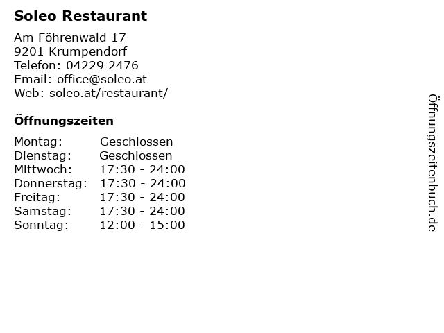 | Öffnungszeiten Soleo Restaurant in Krumpendorf anzeigen | |