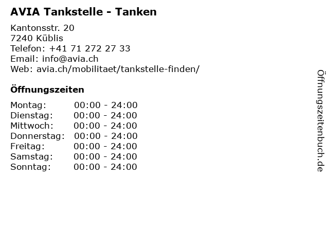 | Öffnungszeiten AVIA Tankstelle - Tanken in Küblis anzeigen | |