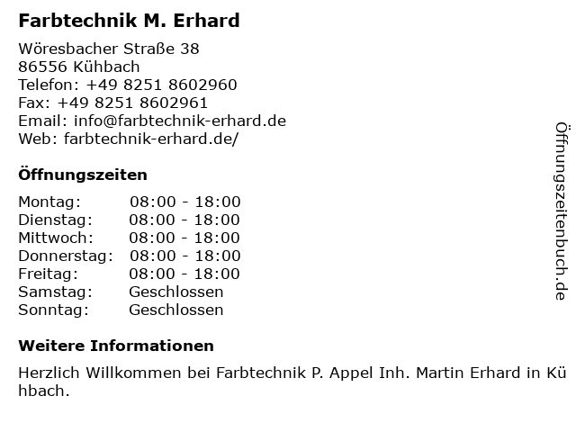 | Öffnungszeiten Farbtechnik M. Erhard in Kühbach anzeigen | |