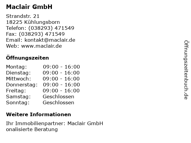 | Öffnungszeiten Maclair GmbH in Kühlungsborn anzeigen | |