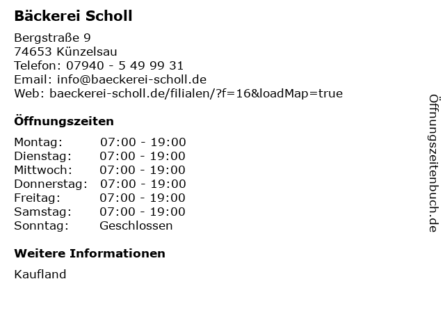 | Öffnungszeiten Bäckerei Scholl in Künzelsau anzeigen | |