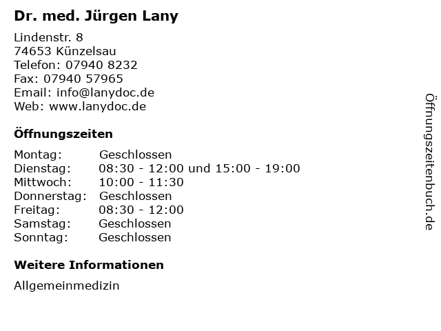 | Öffnungszeiten Dr. med. Jürgen Lany in Künzelsau anzeigen | |