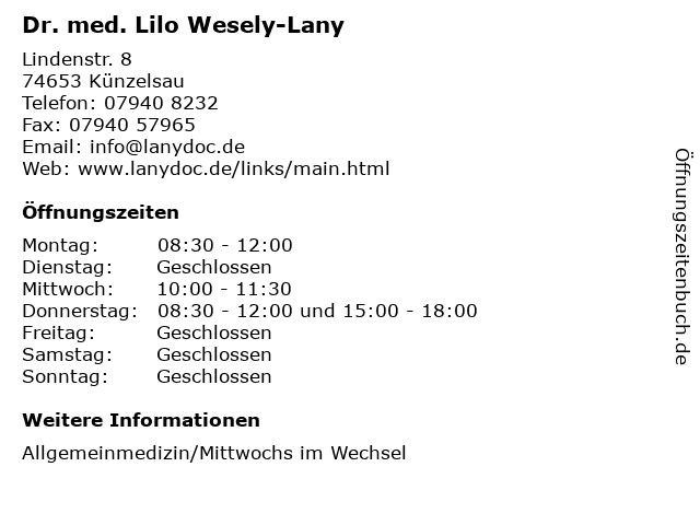 | Öffnungszeiten Dr. med. Lilo Wesely-Lany in Künzelsau anzeigen | |